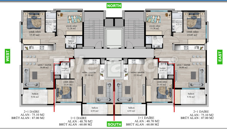 - Jedes Gebäude verfügt über eigenen Aufzug